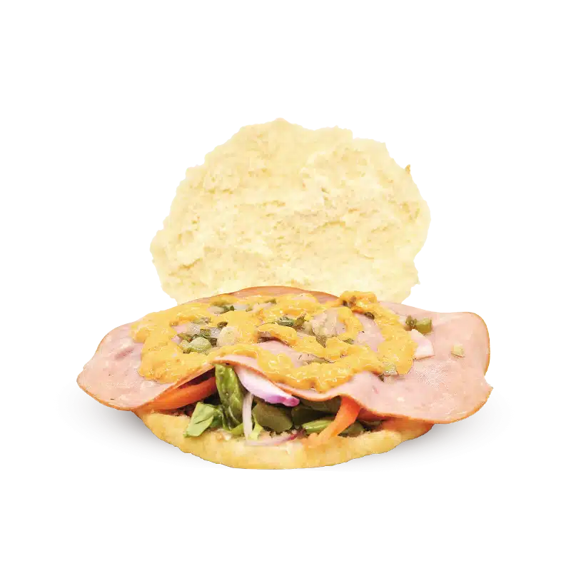Accueil / La carte / Nos Bokits / Bokit Jambon Fromage Bokit Jambon-Fromage Pâte maison frite à la minute, garnie de salade croquante, tomate fraîche et oignon. Emmental français fondant et jambon fumé, accompagnés de notre sauce boucanée maison et de la sauce chien. Un classique qui rappelle le traditionnel jambon-beurre. Allergènes Vous souhaitez commander ? Commander Produits relatifs : Bokit Complet Bokit Poulet Boucané Bokit Lotte Boucané
